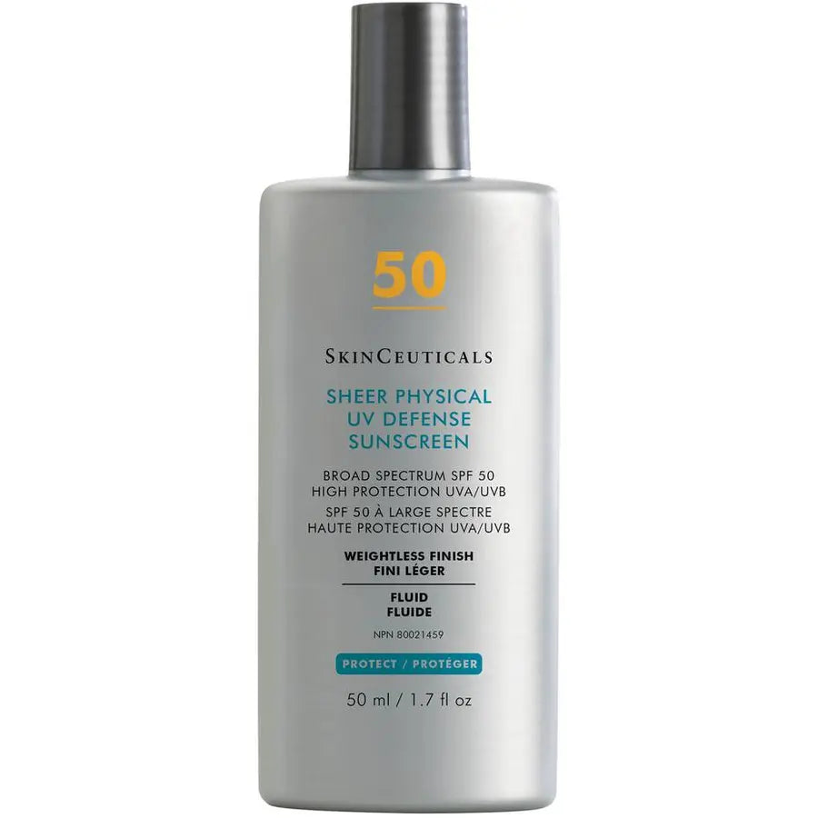 SkinCeuticals Sheer Physical UV Defense SPF 50 is a weightless, 100% mineral sunscreen that provides broad-spectrum UVA/UVB protection while enhancing skin radiance and comfort. Formulated with zinc oxide and titanium dioxide, this sheer fluid blends easily into all skin tones without leaving a white cast.